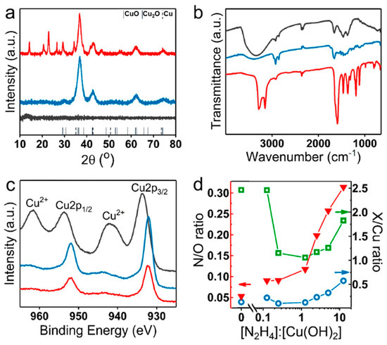 Composition characterization of Cu(OH)2 nanocages and the structures obtained upon their treatment with hydrazine. XRD patterns (a), infrared spectra (b), and XPS spectra of the initial Cu(OH)2 nanocages (black traces), reduced structures obtained at a stoichiometric hydrazine–copper ratio (blue traces) and at 20-fold excess hydrazine (red traces) (c). (d) N/O (red triangles), O/Cu (green squares), and N/Cu (blue circles) ratios obtained from quantitative X-ray photoelectron spectrometry (XPS) analysis of Cu(OH)2 nanocages and products obtained from their treatment with different [N2H4]:[Cu(OH)2] molar ratios (with [N2H4]:[Cu(OH)2] = 0.25 being the stoichiometric ratio).