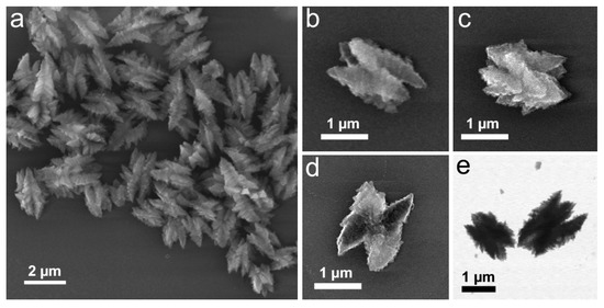 The starting material, amorphous Cu(OH)2 nanocages with a narrow size distribution and a regular shape, were synthesized according to a previously reported method based on the reduction of CuCl2 with NaBH4 in ethanol in the presence of PVP as a stabilizing polydentate ligand [35]. In this method, the formation of Cu(OH)2 nanocages proceeded through the oxidation of initially formed copper clusters. SEM and TEM images of the resultant Cu(OH)2 nanocages with average core size 165 ± 10 nm and extending 51 ± 17 nm arms are shown in Figure 1a and Figure S1. Elongated 17 ± 4 nm-wide bundles comprising the structure observed in the SEM and the TEM images were formed due to the anisotropic nature of Cu(OH)2, as it consists of complex chains formed through coordination of OH− and Cu2+, while the bundle organization and the overall size of the particles were dictated by the stabilizing surfactant [36].