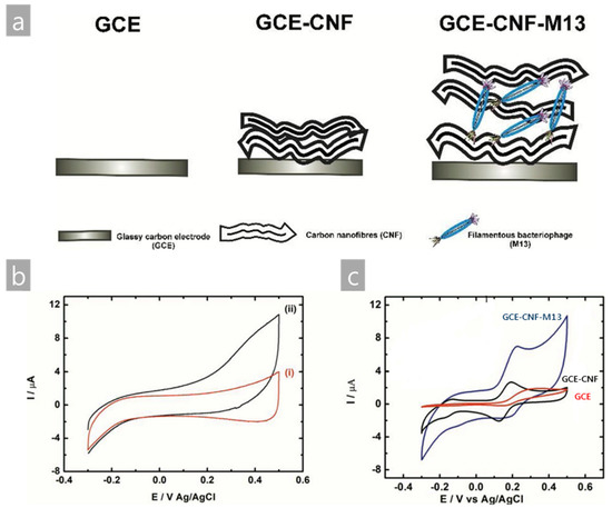 (a) Schematic diagram of the device fabrication of the CNF and M13 bacteriophage complex electrode, (b) cyclic voltammograms (3rd scan) of (i) glassy carbon electrode (GCE)–CNF and (ii) GCE–CNF–M13 bacteriophage treated in 1 mM cysteine solution in PBS, and (c) cyclic voltammograms (2nd scan) of the bare GCE, GCE–CNF, and GCE–CNF–M13 bacteriophage. Reproduced from [39], with permission from Elsevier, 2019.