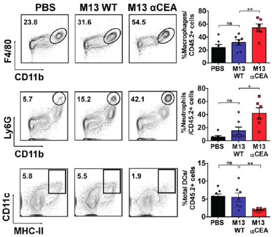 Treating the tumor microenvironment using PBS, wild type M13 bacteriophage, and αCEA-M13 bacteriophages for 24 h. Contour plots shows tumor infiltrating macrophages (F4/80+CD11b+), (upper left), neutrophils (CD11b+Ly6Ghigh), (middle left), and dendritic cells (CD11c+MHC-II+), (lower left). The percentage of each plot (right-hand panel). Reproduced from [44], with permission from Springer Nature, 2017.