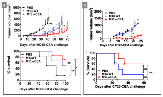 Growth of different CEA tumors ((a) MC38-CEA, (b) CT26-CEA) and survival of mice treated with M13 bacteriophage with or without αCEA. Reproduced from [44], with permission from Springer Nature, 2017.