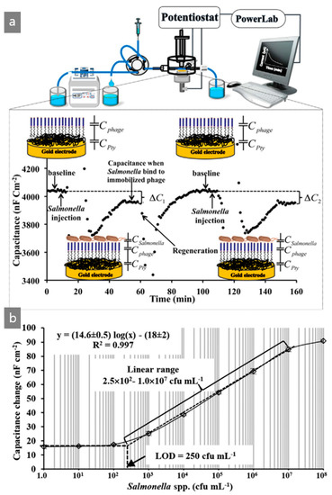 (a) Schematic procedure of the capacitive flow injection system for sensing Salmonella spp. using a M13 bacteriophage-based electrode sensor and (b) linear response of the sensor by number of Salmonella spp. Reproduced from [48], with permission from Elsevier, 2018.
