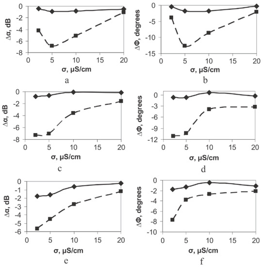 The change in the insertion loss (∆α, left) and phase of the output signal (∆Φ) of the conductivity of the buffer solution. (a,b) 104 cells/mL, (c,d) 106 cells/mL, and (e,f) 108 cells/mL. The solid and dotted lines correspond to the electrically open and shored channels, respectively. Reproduced from [52], with permission from Elsevier, 2018.