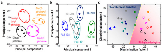 (a) PCA analysis of phthalate derivatives, (b) PCB derivatives, and (c) LDA analysis of phthalate and PCB derivatives using a M13 bacteriophage-based color sensor. Reproduced from [65], with permission from Elsevier, 2017.