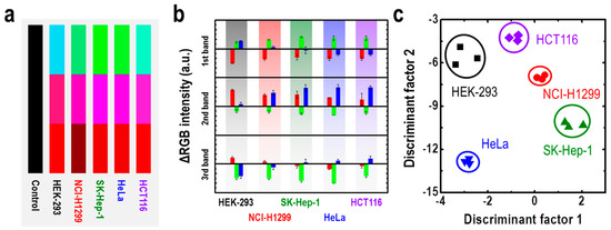An M13 bacteriophage-based color sensor also could be applied to microbial detection. Oh et al. reported a color sensor capable of detecting cancer cell types based on the M13 bacteriophage [72]. The M13 bacteriophage-based color sensor works in the form of a photonic nose, which functions similarly to other researched electronic noses, and shows structural color-based color changes by contact with the specific target materials. The target material in this study was a specific volatile compound that is unusually abundant in various cancer cells. The respiratory by-products of cancer cells, which are distinguished uniquely from normal cells, include hydrazine, xylene, ethylbenzene, ethanol, and toluene [72,73]. Therefore, they measured a range of organic reagents, populations of E. coli, and CO2 concentration using the M13 bacteriophage-based color sensor. Here, the M13 bacteriophage-based color sensor showed significant sensitivity and selectivity for organic solvents, cell population, and CO2 concentration. In this study, selectivity experiment has been done for hydrazine, xylene, ethylbenzene, ethanol, and toluene, volatile organic chemicals. These chemicals can be found in abnormally high concentration of in the lung cancer patient’s respiration [72,73,74,75]. These organic compounds can act like an analytic marker for different cancer cells when released through respiration of cancer cells. Therefore, selective detection of these organic solvents was important to the selective detection of various cancer cells. Finally, each cancer cell’s respiration by-product was analyzed using adjacent color sensors while culturing various types of cancer cells. As a result, they showed excellent discrimination through PCA and color analysis, with the first two discriminant factors accounting for 99.8% (Figure 12) [72].