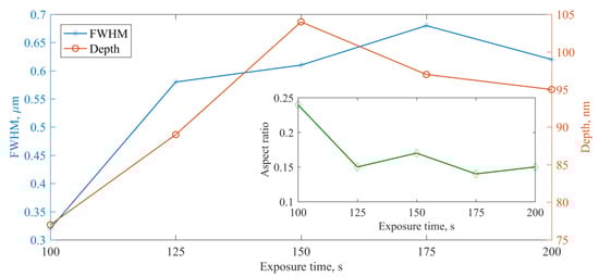 Variation of Full Width of Half Maxium (FWHM) and depth of the holes with respect to exposure time at constant laser beam power. Inset shows the variation of aspect ratio with respect to exposure time.