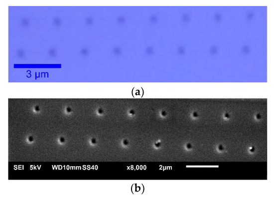 The preliminary visualization of the structure was performed by using our microscope in a confocal mode. Figure 4a represents the typical test structure in confocal view with 100× magnification. The holes are regular and seem to have uniform depth. However, the contrast and resolution of the confocal microscope mode is limited, so to assess the quality of the pattern, scanning electron microscope (SEM) was used. The scanning was performed with JEOL JSM-6010Plus/InTouchScope (JEOL, Tokyo, Japan). Figure 4b shows the SEM image of the final pattern on the photoresist after its development. Approximately 2–5 nm thick gold layer was deposited on the sample prior to the experiment. It can be clearly seen from the figure that lines of the holes resemble each other in shape and local orientation and size of the holes are very uniform. This is also confirmed from AFM analysis, which is discussed further in this section.