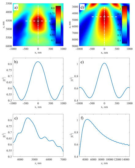 Radiation transmission through (a–c) the pattern of holes and (d–f) the pattern of grooves; (a,b) electric field intensity at y = 0; (b,e) transverse cross-sections of the focal spots along the dashed lines in (a,d); and (c,f) longitudinal cross-sections of the focal spots along the dashed-dotted lines in (a,d). The transverse cross-section of the focus in the case of hole structure is slightly larger than for grooves, but it is significantly shorter in the longitudinal direction.