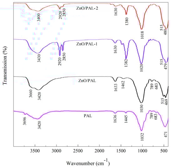 To determine whether the Span 40 and Tween 20 were capable of inducing surface modification on ZnO/PAL or not, FTIR spectra were conducted. The FTIR spectra of PAL, ZnO/PAL, ZnO/PAL-1 and ZnO/PAL-2 are shown in Figure 1. The absorption bands at 3696 and 3420 cm–1 were ascribed to the –OH stretching vibration of Mg–OH groups, the stretching vibration of coordinated water and the stretching vibration of adsorbed water, respectively [36,37]. After the hydrothermal process and the loading of ZnO crystal, there is no clear change in the characteristic bands of Si–O stretching vibrations of PAL at 1194 and 1086 cm–1 [36]. By contrast, the new absorption band at 515 cm–1 was attributed to the stretching vibration of the Zn–O band of ZnO/PAL. After incorporation of Span 40 and Tween 20, the bands at 2850 and 2920 cm–1 were observed, which were attributed to the characteristic stretching vibration bands of CH2 derived from Span 40 and Tween 20 [38]. Meanwhile, it could be inferred that ZnO and a small amount of Span 40 or Tween 20 simultaneously was loaded and attached on the surface of PAL during the preparation process.