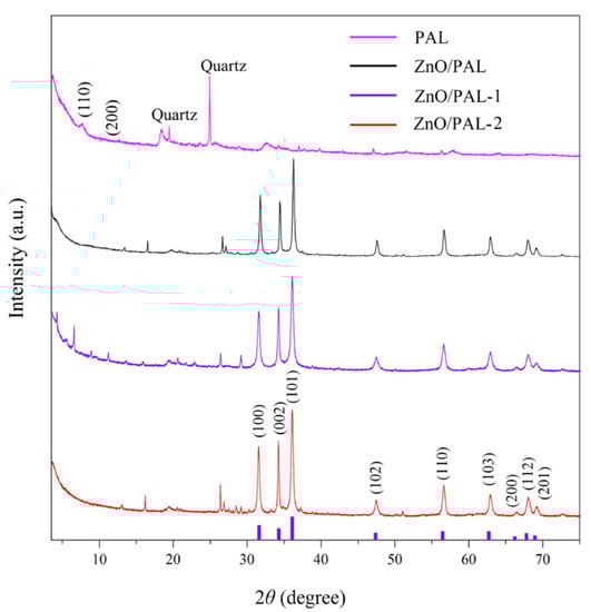 The crystalline structures of PAL and ZnO/PAL nanocomposites were characterized using XRD (Figure 2). In the XRD pattern of PAL, the diffraction peaks at 2θ of 8.38°, 13.74°, 16.34° and 34.38° were attributed to the characteristic peaks of PAL [37]. The diffraction peaks located at 2θ = 20.8° and 26.7° are the typical diffraction peaks of quartz [37]. After incorporation of ZnO, the diffraction peaks of ZnO were observed from the XRD patterns of the obtained ZnO/PAL at 2θ = 31.76°, 34.46°, 36.26°, 47.58°, 56.60°, 62.92°, 66.46°, 67.96° and 69.09°, which corresponded to the planes of (100), (002), (101), (102), (110), (103), (200), (112) and (201), respectively, indicating a wurtzite structure (JCPDS standard card 36-1451) [31]. In particular, it could be clearly seen that the (110) diffraction peak of PAL at 2θ = 8.38° weakened after hydrothermal reaction. The XRD pattern of ZnO/PAL-1 was not similar to that of ZnO/PAL and ZnO/PAL-1 nanocomposites, there was a characteristic peak at 2θ = 6.05° of ZnO/PAL-1 after the hydrothermal process, which might be ascribed to the (001) direction peak of smectite. This phenomenon might be attributed to the transformation of PAL into smectite at alkaline medium during the hydrothermal process [39]. The particle grain size of ZnO/PAL nanocomposites could be calculated based on the X-ray line broadening method using Scherrer’s equation: