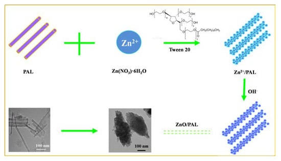 The preparation procedure of ZnO/PAL nanocomposites is illustrated in Figure 5. It is well-known that PAL has a permanent negative charge (Figure S4, Supplementary Materials); therefore, due to the charge between the PAL and Zn2+, the positive Zn2+ could be adsorbed on the surface of rod-like PAL. Then, the adsorbed Zn2+ was transformed into Zn(OH)2 on the surface of PAL with the increasing of OH−. Thereafter, Zn(OH)2 was changed into ZnO crystals after the hydrothermal process accompanied with the crystal phase transition of PAL. Moreover, the addition of Tween 20 was a necessary step for the formation of spindle-shaped ZnO/PAL nanostructures. During the hydrothermal process, the nucleation and seed growth of ZnO occurred, and subsequently, the generated ZnO assembled on the surface of rod-like PAL. In the following step, the excess Tween 20 played an important role in the assembly of ZnO crystals on the PAL surface. When Tween 20 was dissolved into aqueous solution, it reduced both the dielectric constant of water and the surface tension of ZnO crystals. The “surface-solvent effect” influenced the growth and deposition of ZnO seeds on PAL. The deposition and growth rate of ZnO seeds in the middle were faster than at the two ends of PAL; thus, spindle-like structures appeared [27,31]. Therefore, it was suggested that the suitable surfactant-assisted process might be an easy way for the preparation of a particular structure of ZnO/PAL nanocomposites.