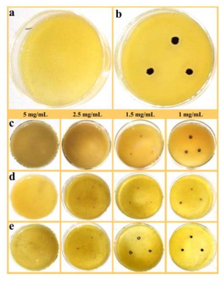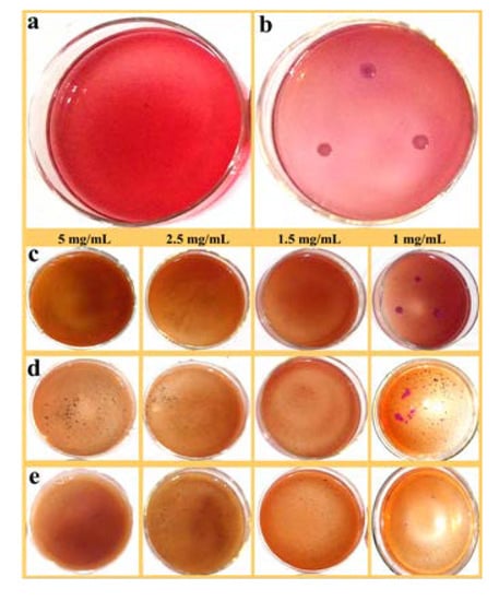 (a) Blank control, (b) positive control of E. coli and E. coli treated using (c) ZnO/PAL, (d) ZnO/PAL-1 and (e) ZnO/PAL-2.