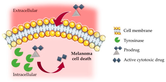 Schematic representation of tyrosinase-mediated prodrug release in a melanoma cell. Adapted from [28], with permission from Elsevier, 2017.