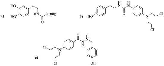 Examples of first-generation prodrugs. (a) Prodrug with a dopamine moiety and a carbamate linkage; (b) Prodrug with urea-linked aniline mustard; (c) Concept of a prodrug displaying a phenolic activator, a hydrazine linker and a nitrogen mustard effector.