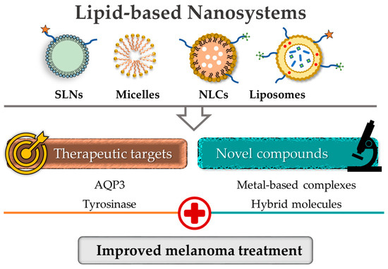 To prepare this review, an extensive literature search from two databases—PubMed and Science Direct—was performed to generate a critical and comprehensive overview of potential targets for melanoma treatment and the most recent advances in the search for new or more potent molecules formulated in lipid-based nanosystems, with anticancer activity against melanoma. The keywords for the search consisted of combinations of the following terms—melanoma, aquaporin-3, tyrosinase, lipid-based nanosystems and liposomes.