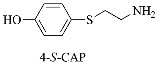 Since tyrosinase is a putative therapeutic target against melanoma, a sulfur homolog of tyrosine, 4-S-cysteaminylphenol (4-S-CAP, Figure 9) was synthetized [181]. Further, it was shown to be a suitable tyrosinase substrate, leading to selective cytotoxic effects against melanocytes and melanoma cells [181]. Subsequently, in order to combine chemotherapy and hyperthermia modalities against malignant melanoma, 4-S-CAP was incorporated in magnetite cationic liposomes (Table 3, C6) [182]. The nanoformulation exerted cytotoxic effects on B16 melanoma cells (Table 4, F4), being less toxic to normal human dermal fibroblasts (NHDF). Moreover, when cells were treated with nanoformulated 4-S-CAP combined with hyperthermia, an additive therapeutic effect was achieved. In a B16 murine melanoma model, in mice receiving liposomal 4-S-CAP and hyperthermia, tumor growth was strongly suppressed, with complete regression of 17% subcutaneous melanoma tumors [182].