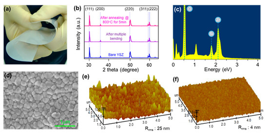 (a) a bent image of flexible Yttria-stabilized zirconia ceramic (YZS) substrate, (b), X-ray diffraction (XRD) spectra of a YZS substrate (red) a bare condition, (orange) after 20 times of bending, (blue) after the annealing at 800 °C for 5 min. (c) energy-dispersive X-ray spectroscopy (EDX) spectrum and (d) secondary electron microscopy (SEM) image of SiO2 coated YZS substrate. Atomic force microscopy (AFM) images of (e) a bare YZS substrate, (f) a 50 nm thick SiO2 coated YZS substrate.