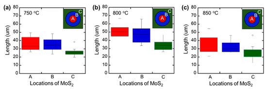 The statistical distribution of the lengths of one side of triangular MoS2 crystals grown (a) 750 °C, (b) 800 °C, and (c) 850 °C, respectively. Three different regions, (A), (B), and (C), in each 1.5 cm2 size substrate were measured. Region (A) refers to the 3 mm central circle, region (B) refers to another 5 mm circle outside of the region (A), and region (C) refers to the rest of the peripheral area to the edge of the sample.