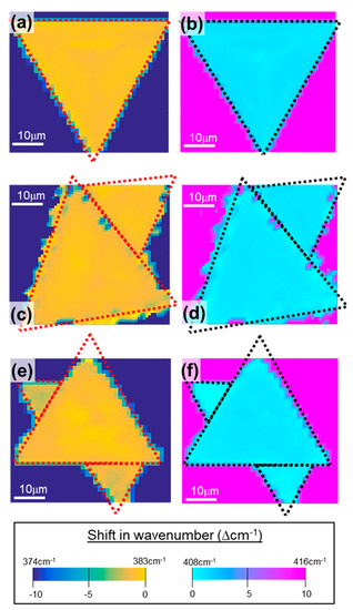 Raman mapping of MoS2 crystal showing (left) E12g peak at 383 cm−1 and (right) A1g peak at 408 cm−1 when grown at 750 °C for (a,b), 800 °C for (c,d), and 850 °C for (e,f).