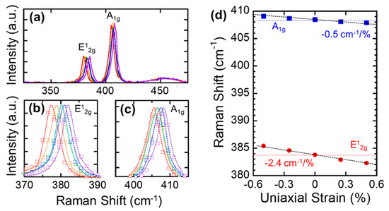 Finally, we investigated the evolution of the MoS2 Raman spectra under different uniaxial strain conditions. Raman spectroscopy has been widely used to investigate strain in other 2D materials, because of its nondestructive characterization capability of lattice vibrations sensitive to strains [49,50,51,52]. The thickness of MoS2 for this stain-Raman spectrum study was the same as for the MoS2 crystals that were used for the Raman characterization. To accurately measure the changes in the Raman spectra under the uniaxial strain conditions, we employed convex- and concave-shaped metal molds that had different curve radii ranging from 25 mm to 50 mm, which corresponded to the uniaxial tensile and compressive strains up to 0.5%. The amount of strain applied to the MoS2 is calculated by the following equation: