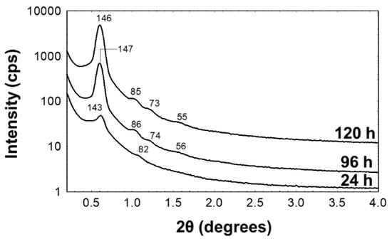 In order to achieve the preparation of hierarchical porous carbon beads with large mesopores, we selected the triblock copolymer F127 as the primary porogen. The use of F127 with phenol:formaldehyde:NaOH molar ratios of 1:2:0.1, as previously reported [23], consistently yielded poorly ordered materials in our laboratory, that showed no reflections in the low-angle X-ray diffraction pattern and no evidence of ordered mesophases in the transmission electron microscope images. However, it was possible to prepare ordered films using a dual template approach in which F127 was spiked with Brij 58. Synergistic mixtures of surfactants result in lower critical micellization concentrations and changes to interfacial tension [37]. Brij 58 has a long hydrocarbon chain that lowers the surface area of its interaction with water. The increased polarity between the block copolymer/surfactant mixture was likely responsible for the better order within the structure. SAXD patterns of thick phenolic resin films cured at 100 °C for increasing time periods are shown in Figure 1. The strong primary reflection at a d-spacing of 150 Å and the four weak higher angle reflections, indicate the formation of a well ordered mesophase. It is apparent from the increased intensity of the higher order reflections that the degree of mesophase ordering improved as the curing time increased. The sample cured for 120 h (Figure 1c) had d-spacings at 146, 85, 73 and 55 Å that correspond well with a hexagonal unit cell with a value of 169 Å. The original synthesis by Meng, et al. found a lattice parameter a of 139 Å [23].