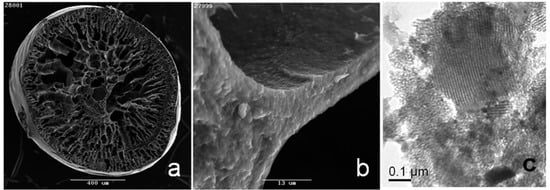 The SEM images of the hierarchical composite carbon beads prepared by infiltrating the PAN-derived carbon beads with F127-B58 phenolic resin are shown at low and high magnification in Figure 2a,b. The beads after final pyrolysis in argon at 700 °C had a smooth outer surface. Internally, they displayed the characteristic radial macroporosity of PAN. At high magnification, the surfaces of these internal macropores appeared to be comprised of sub-micron particles. Detailed TEM examination of the composite beads showed the presence of both ordered and disordered mesopores (Figure 2c). Much of the specimen consisted of rather amorphous material, originating from the macroporous PAN walls. However, fringes that were characteristic of ordered mesophase material deriving from incorporated resol were relatively easily located.