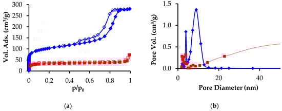 (a) Nitrogen adsorption-desorption isotherm and (b) pore size distribution of the PAN beads before (red squares) and after (blue diamonds) resol infiltration, measured at 77 K.