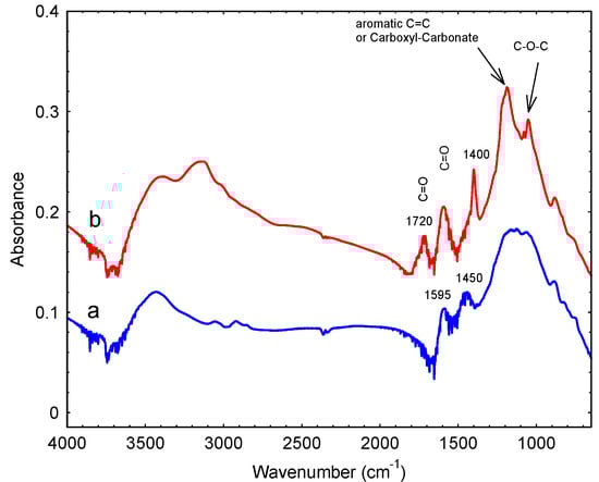 Many methods are available for activating the surfaces of carbon materials. In the present study, APS was used as per previously described procedures [38]. The FTIR spectra of as-prepared hierarchical carbon beads are compared with that of APS-treated beads in Figure 4. On APS treatment, several new bands were generated relative to the untreated samples. Most notable are the additional bands at 1053, 1186, 1400, 1720 and 3147 cm−1. These bands can be assigned as follows in Table 1, based on [39].