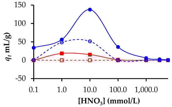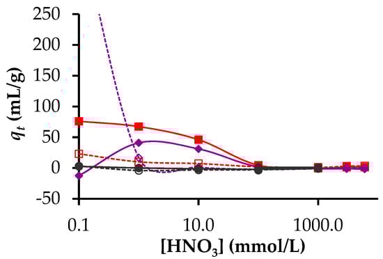 Figure 5 shows that neither hierarchical carbon beads nor activated hierarchical carbons beads possessed any significant affinity for 243Np3+. In contrast, both carbon materials showed some capacity for the adsorption of both 153Gd3+ and 241Am3+ at acid concentrations less than 0.01 mol/L (Figure 5). For the beads that had not been activated, a qt value of 400 mL/g was obtained for 153Gd3+ adsorption from the solution with an acid concentration of 0.1 mmol/L. This decreased to values close to zero for acid concentrations greater than 1 mmol/L acid. For the activated beads, low qt values were obtained for 153Gd3+ adsorption in the concentration range of 100 to 1 mmol/L. At 0.1 mmol/L acid, no 153Gd3+ adsorption was observed for the activated beads.
