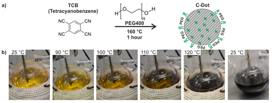 Polyol-mediated synthesis of C-dots with 1,2,4,5-tetracyanobenzene (TCB) in polyethylene glycol 400 (PEG400): (a) scheme of the synthesis of nitrogen-containing C-dots with PEG surface functionalization; (b) course of the reaction and color change at 100 to 120 °C while heating a solution of TCB in PEG400 from room temperature to 160 °C as well as dark black C-dot suspension after cooling to room temperature.