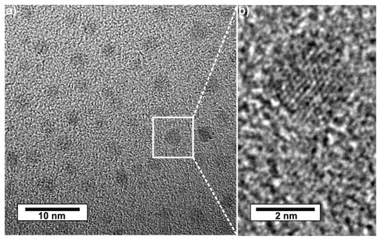 Subsequent to polyol-mediated synthesis, separation, and purification, the presence of C-dots and their size were examined by transmission electron microscopy (TEM). Accordingly, C-dots with a spherical shape, narrow size distribution, and diameters of 2–4 nm were obtained (Figure 2). High-resolution (HR)TEM images clearly show lattice fringes and indicate the crystallinity of the as-prepared C-dots (Figure 2b). The observed lattice distance of 1.91 Å relates to graphite (d101 with 2.03 Å, [32,33]) but definitely shows a certain reduction. Such reduced lattice fringe distance was already observed for nitrogen-containing C-dots and is ascribed to the higher polarity of heteroatom-containing graphite layers in comparison to pure graphite layers [6,20,21,22,23,24,25]. In contrast, C-dots prepared via the polyol synthesis with similar conditions but in absence of TCB exhibited a larger lattice fringe distance of 2.05 Å [16,18]. In regard to the determination of the particle size, it needs to be noticed that dynamic light scattering (DLS) could not be performed since the fluorescence of the as-prepared C-dots after excitation with the DLS-internal laser (λEmission: 633 nm) deteriorated the data evaluation.