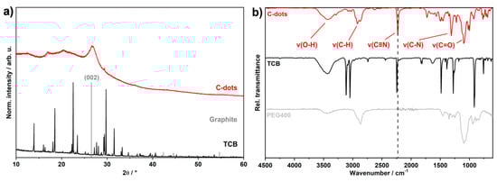 X-ray diffraction patterns (XRD) of the as-prepared C-dot powders are characterized by a broad background due to non-specific scattering. Only the most intense (002)-Bragg peak of graphite is visible at 26.6° of 2-theta (Figure 3a). The broadening and low intensity of this Bragg peak are in accordance with the small size of the C-dots. Moreover, Bragg peaks related to TCB as the starting material do not occur. Fourier-transform infrared (FT-IR) spectra show the as-prepared C-dots in comparison to pure TCB and PEG400 (Figure 3b). Due to the synthesis in PEG400, the surface of the as-prepared C-dots is inherently coated by the polyol. Thus, FT-IR spectra show the characteristic vibrations of PEG400 with ν(O–H) (3600–3100 cm–1), ν(C–H) (3000–2800 cm–1), ν(C=O) (1100 cm–1), and the fingerprint with weak δ(C–H)/δ(C–C) vibrations between 1400 and 750 cm–1. These vibrations are in agreement with pure PEG400 as a reference (Figure 3b). Additional vibrations at 1750–1600 cm–1 point to aromatic C=C bonds and indicate the formation of graphite-type C-dots [32,33,34]. Finally, the characteristic vibrations at 2228 cm–1 (ν(C≡N)) and 1315 cm–1 (ν(C–N)) validate the presence of the remaining cyano groups and point to the nitrogen-containing carbon network (Figure 3b). Interestingly, ν(C≡N) shifts by about 15 cm–1 to lower wavenumbers in comparison to pure TCB (ν(C≡N): 2245 cm–1), which can be attributed to a different chemical environment in the C-dots.