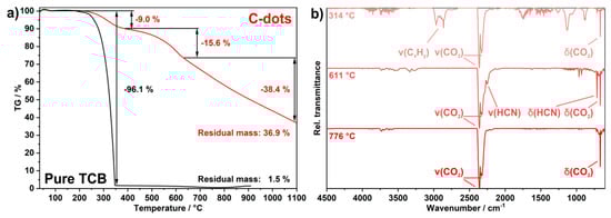 Thermal decomposition of the as-prepared C-dots: (a) thermogravimetry (nitrogen atmosphere, 27.7 mg of sample) with pure TCB as a reference (nitrogen atmosphere, 29.6 mg of sample); (b) Fourier-transform infrared spectra of the gaseous decomposition products of the thermogravimetric analysis at three selected temperatures.