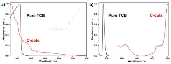 Absorption of the as-prepared C-dots: (a) UV–Vis spectra and (b) excitation spectra (suspension in PEG400, monitored at λem = 715 nm, excitation of the C-dots could not be measured below 370 nm due to λem/2 peak at 357 nm). Pure TCB is shown as a reference (solution in chloroform, monitored at λem = 332 nm).