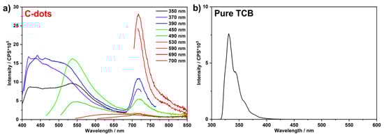 Emission of as-prepared C-dots: (a) emission spectra (suspension in PEG400) at different wavelengths of excitation; (b) emission spectrum of pure TCB (solution in chloroform, excited at λexc = 272 nm).