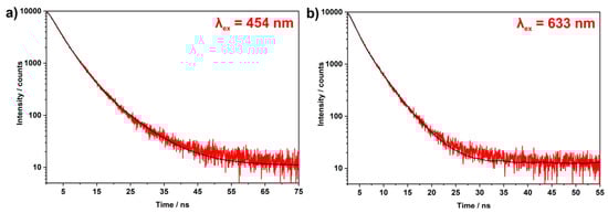 Emission spectra of the as-prepared C-dots indicate continuous emission between 400 and 850 nm with a broad maximum at 400–600 nm and a narrow maximum at 715 nm (Figure 6a). The emission at 400 to 600 nm clearly depends on the wavelength of excitation (Figure 6a). In contrast, the emission maximum at 715 nm is stationary and its wavelength position not influenced by the wavelength of excitation. The emission intensity of this deep-red emission is comparably high if excited via the C-dots at 400–500 nm with large Stokes shift (Figure 6a). The deep-red emission is comparably low upon excitation between 500 and 600 nm since the absorption of the C-dots is low in this wavelength regime. However, the deep-red emission is even by a factor of 2–3 stronger if excited above 600 nm with small Stokes shift. For long-wavelength excitation (690 nm) with subsequent deep-red emission (715 nm), moreover, a remarkably high quantum yield of 69% was determined. Excitation at 424 nm results in a slightly lower quantum yield of 50% for the deep-red emission (715 nm). This finding is to be expected due to the larger Stokes shift between excitation and emission. Lifetime measurements for the emission at 715 nm for both types of excitation (λexc = 454 nm and λexc = 633 nm) result in a decay of 1.4 to 4.3 ns (τ1 = 1.8, τ2 = 4.4 ns for λexc = 454 nm; τ1 = 1.4, τ2 = 3.6 ns for λexc = 633 nm) (Figure 7). These values are in good agreement with previously reported lifetime data of C-dots (τ ~ 1–10 ns) [35,36,37]. Finally, it needs to be noticed that the emission of C-dots made from TCB is significantly different from the emission of pure TCB (Figure 6b). Thus, pure TCB only exhibits an emission peak at 320–370 nm, which is independent from the wavelength of excitation. Moreover, no emission occurs above 400 nm.
