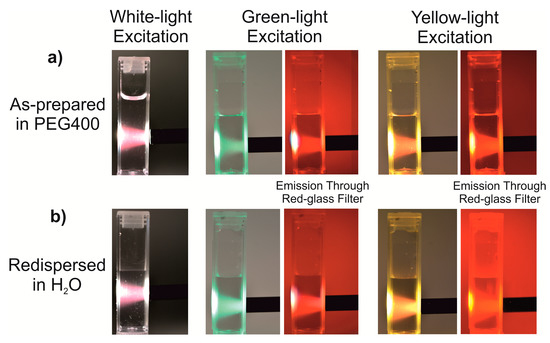 Photos showing the red emission of the as-prepared C-dots in (a) PEG400 and (b) H2O upon excitation with daylight, blue-green light, and yellow light. All photos were taken without a filter as well as with a red filter to prove red-light emission.