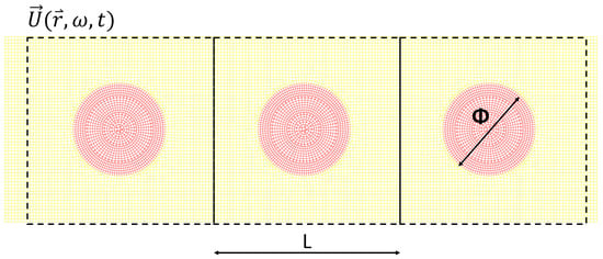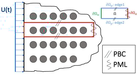 We used Finite Element numerical calculations to study the vibrational properties of a 2D semi-infinite elastic system with circular inclusions positioned along a cubic lattice (Figure 2). For wavefronts parallel to the left boundary, this semi-infinite domain can be numerically simplified by looking at a single line of inclusions, and imposing periodic boundary conditions along the vertical direction (see Supplementary Materials for more details). We thus focused our study on a single alignment of inclusions, with periodic boundary conditions (PBCs) imposed at the top and bottom of the sample shown in Figure 3, and with absorbing boundary conditions, or PML (Perfect Matched Layers) on the right side, to avoid waves reflection [,,,,]. The technical details about the boundary conditions and discretization schemes used in the calculations, are presented in Appendix A.