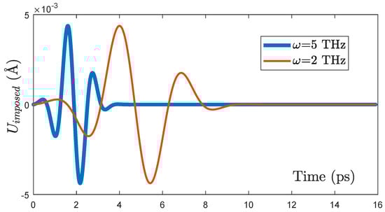 Wave packet imposed as the displacement of the left side of the sample, for two different frequencies: 2 THz, 5 THz
