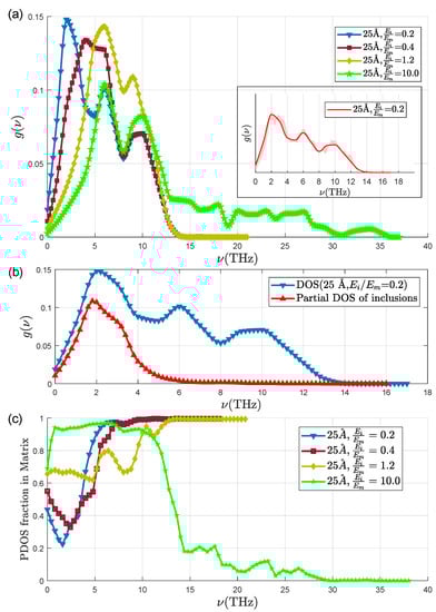 Like in our previous (MD) works [,,], the matrix material is a model amorphous silicon, linearly elastic with isotropic homogeneous elastic behavior characterized by the Young’s modulus GPa, the mass density kg/m and the Poisson ratio . For the inclusions, the Poisson’s ratio is supposed to be the same, while the Young’s modulus is taken as another control variable and defined as , this latter being the stiffness ratio that was tuned from 0.2 to 10. Table 1 summarizes the values of the parameters used in this work:
