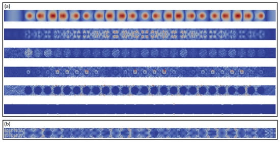 (a) Visualization of the normal modes obtained in the system with = 0.2 and Å. The frequencies of the characteristic normal modes (from top to bottom) are: = 0.325195 THz ( = = 2.04 THz); = 0.790191 THz ( = 4.96 THz); = 2.00000 THz ( = 12.57 THz); = 3.99998 THz ( = 25.13 THz); = 6.00019 THz ( = 37.70 THz); = 14.22239 THz ( = 89.36 THz). (b) Visualization of one normal mode obtained in the system with = 10 and Å. The frequency of the mode is: = 2.00281 ( = 12.58 THz).