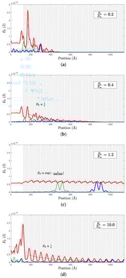 As an example, we report in Figure 7 the kinetic energy envelope (red curve) for Å at a wave-packet frequency of THz, for different rigidity contrasts. Instantaneous wave-packets (green and blue curves) are also shown for clarity. The positions of the inclusions are indicated by the gray area delimited by dotted lines. It is clear that the envelope presents oscillations correlated with the presence of interfaces. Moreover, the inclusions cause a more or less efficient attenuation of the kinetic energy along the main direction of propagation. Since the simulations are performed at constant energy (no damping term in the numerical scheme), the observed attenuation is not related to a global dissipation of energy, but it is due to a redistribution of the kinetic energy in directions different from the one of propagation, so that, when averaging this effect along the transverse y-direction, an effective attenuation along the x-direction appears. The strength of this attenuation depends on the different control parameters, such as inclusions size, wave-packet frequency and rigidity contrast. For example, in case of a weak rigidity contrast (Figure 7c) a global exponential attenuation similar to a Beer-Lambert law is observed [,]