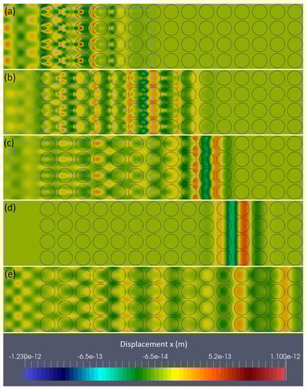 To confirm our interpretation of the energy envelope behavior, we report in Figure 8 the displacement field for THz and different rigidity contrasts. Here we can see that at this frequency for a soft inclusion (Figure 8a) the wave-packet looks pinned inside the inclusions, while for no rigidity contrast () it is insensitive to their presence and propagates without any perturbation (Figure 8d). It is worth underlying that all snapshots have been taken at the same time, which clearly shows that the effective velocity of the wave-packet increases with the inclusion rigidity, so that when inclusions are more rigid than the matrix the wave-packet is accelerated (Figure 8e). Moreover, except for the case of no contrast, the wave-packet is spread, and thus attenuated, along the x-direction.