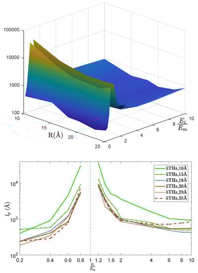 Penetration length , with the stiffness ratio and r the radius of inclusion for the frequency of wave packets = 5 THz.(Top: 3D Bottom: 2D)