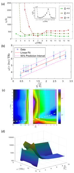 Despite for the reported case the penetration length for a more rigid inclusion is always longer than for soft inclusions, it is however possible to reverse the situation and get a more efficient sound attenuation with rigid inclusions if another excitation frequency is used. Indeed, as shown in Figure 12a, the penetration length depends on the frequency and, for rigid inclusions, displays a clear minimum at 7 THz. This effect is due to a resonance of the inclusions that will keep the acoustic energy. Indeed, as seen in Figure 12b, the frequency of the minimum in the penetration length evolves linearly with the sound velocity within the inclusion, meaning that inclusions specific vibrations play a key role in determining the frequency dependence of . This resonant effect is reported in the Figure 12c with white long-dashed line showing the proportionality in the minimum frequency with the sound velocity (in log-linear scale). A 3d plot (Figure 12d) underlines this non-monotonous dependence of the penetration length on the frequency, especially in the high rigidity case that appears to be the most selective with the frequency.