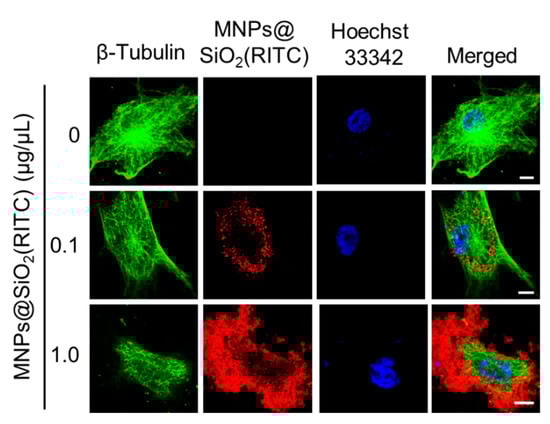 - Park, K.S.; Tae, J.; Choi, B.; Kim, Y.S.; Moon, C.; Kim, S.H.; Lee, H.S.; Kim, J.; Kim, J.; Park, J.; et al. Characterization, in vitro cytotoxicity assessment, and in vivo visualization of multimodal, RITC-labeled, silica-coated magnetic nanoparticles for labeling human cord blood-derived mesenchymal stem cells. Nanomedicine 2010, 6, 263–276. [Google Scholar] [CrossRef]