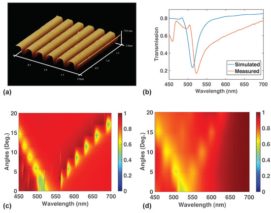 (a) Atomic Force Microscope (AFM) image of a fabricated sample. The height of the lines are measured to the around 60 nm while the period of the samples have been measured to be around 320 nm. (b) Comparison of p-polarized transmission versus wavelength at zero-angle from experiment and simulation. (c) Unpolarized simulation of transmission of a sample with the same dimensions as (a). (d) Measured transmission as a function of angle and wavelength with unpolarized source. It can be seen that (c,d) are in relatively good agreement with each other.