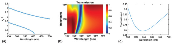 (a) Modal propagation vector in the z direction as a function of wavelength of the propagating modes in the grating structure. There is a cutoff wavelength near 600 nm below which a second mode begin to exist below this wavelength. (b) Plot of transmission versus wavelength for different heights of the grating structure. A reflective region exists over a wide range of height of gratings around the wavelength range of 500–550 nm. (c) Effective medium theory (EMT) calculation of the grating structure in Figure 1a. The minimum transmission corresponds well with the minimum position in (b) at a height of 100 nm.