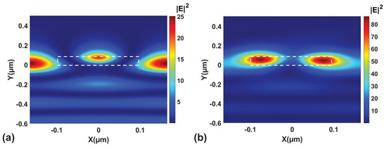 To recap, in Figure 3a there exist a cutoff wavelength below which there are two modes and above which there is only one mode. In Figure 1, we have two windows of reflectance, one below the cutoff wavelength and one above the cutoff wavelength. To understand the distinction between the two regimes, we examine the electric field profiles at these reflectance maxima. The field profile at maximum reflection at zero and five degrees of incidence and its electric field intensity profile is shown in Figure 4a,b, respectively. It can be seen that the field profile is one where the field intensity is outside the high index material with a small region in the middle to top region of the high index material. This is somewhat in agreement with field profile of HCGs in the dual mode regime [37]. Thus, it is possible to have angular and wavelength selectivity in the dual mode regime as well as in the single mode regime as described by Refs. [31,37].