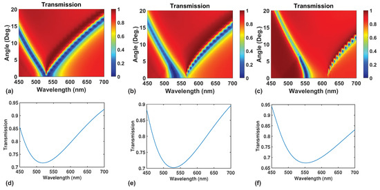 If we now vary the fill fraction of the grating from 0.4 to 0.7 while keeping the period fixed at 330 nm, we observe that the position of the reflection window changes accordingly as shown in Figure 5a–c. The position of the maximum reflection changes with wavelength and the width of the high reflection region also reduces with increasing filling fraction. One can use fill fraction to tune the position and the width of the reflection window. Mode analysis like the one in Figure 3a reflect changes in the cutoff wavelength cannot reflect the position of maximum reflectance. However, if we use EMT [33], we will be able to obtain a spectrum of reflection versus wavelength much more quickly than using full-wave simulations. Figure 3c and Figure 5d–f show the calculated transmission versus wavelength from EMT. The peak position for reflectance changes for different fill fraction and corresponds well to the positions of the reflection window for Figure 5a–c. However, both the magnitude and the width of reflectance predicted by EMT do not agree well with full-wave simulations. Thus, EMT also has its limits when it comes to predicting exact optical properties of LCGs. In this work, we did not explore the possibility of LCGs to have broadband reflectance but it is certainly a good topic to look into in a future study.